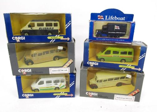 Quantity of boxed Corgi and Lledo diecast model cars to include Corgi C676/3 Ford Transit, C676/1 Ford Transit, C676/2 Ford Transit, D949/17 Bedford type OB Coach, Q949/22 Bedford type OB Coach, 97115 Bedford OB coach Seagull Coaches, 2X Grey Green A.E.C. Regal, Days Gone VE1003 VE Day set, etc (12)