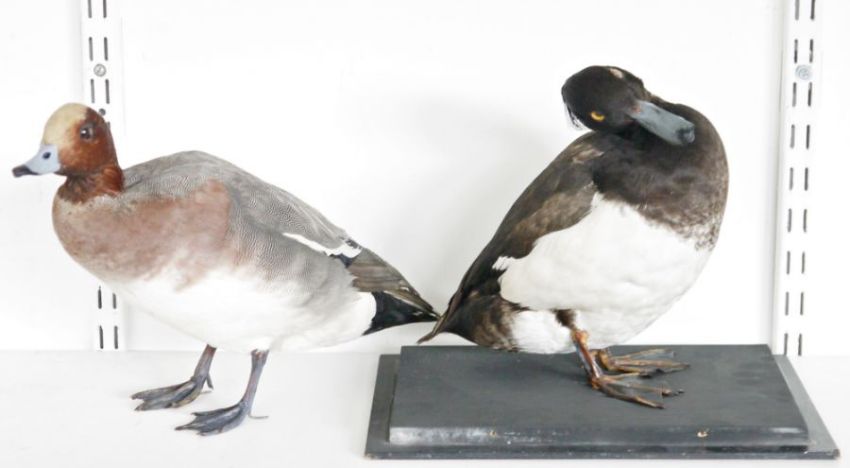 Taxidermy Northern shoveler (Spatula clypeata), modelled freestanding, 26cm high, a taxidermy Tufted Duck (Aythya fuligula), on painted wooden base, 31cm wide x 27cm high, a taxidermy Moorhen (Gallinula chloropus), modelled freestanding and a Taxidermy Eurasian Wigeon (Mareca penelope) (4)