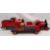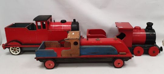 Three large painted wooden locomotives to include a red and blue locomotive a red and black locomotive and tender and a red and back locomotive (3)
