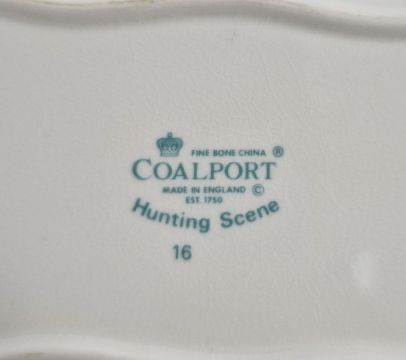 Crown Staffordshire fine bone china hunting scene pattern part table service with printed green marks, comprising a table bell, a vase, a ginger jar and cover, two breakfast bowls, two side plates, a dinner plate, a sugar bowl, a small oval dish, a shaped rectangular box and cover and a mug, brown glazed with printed and impressed marks and two Beswick pottery models of foals