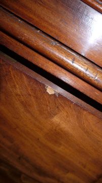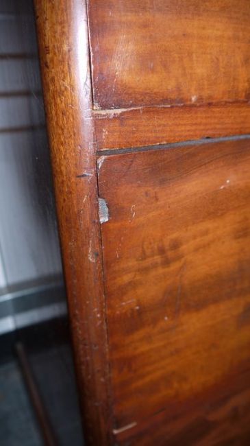 Wear throughout. Scratches and dents especially to the the top of the chest section. Chips especially to edges of cupboard doors and drawers. The lock has been removed. Please see additional photos.
