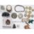 Straw work box with assorted coinage, commemorative medals, badges and costume jewellery, including a Victorian yellow metal mounted cameo brooch, a Queen Victoria 50th Jubilee medal, assorted models of hippos and other animals