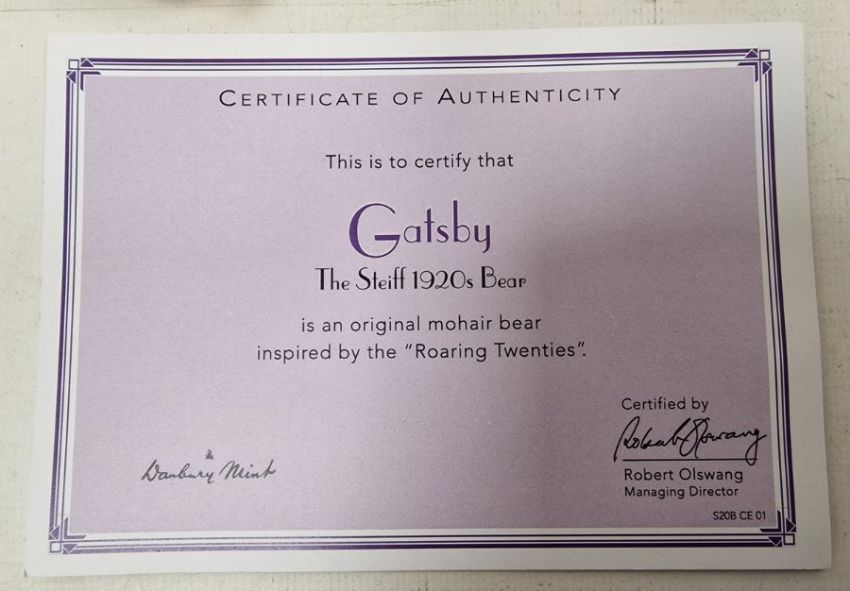 Steiff 'Gatsby' 1920's bear, Danbury Mint, 664403, wearing cream jacket, purple waistcoat and boater, with certificate, 27cm, boxed