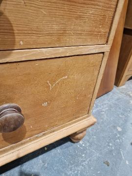 Victorian pine linen press, the upper section enclosed by two arched panel doors over chest base comprising two short and two long drawers, each with turned knob handles, on turned supports, 222cm x 134cm x 59cm, Internal depth 51cm Approx.