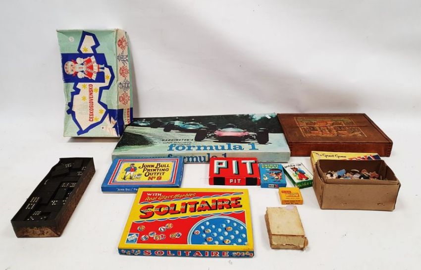 Vintage children's board games and books to include Waddington's Formula 1 card racing game, John Bull printing outfit No.8,  John Waddington LTD. Pit, Codec production Solitaire, Romanische Baukunst fur Illumination, Little Pet's story book, Collins Wonder Colour books, My Book of Kittens and Puppies, etc