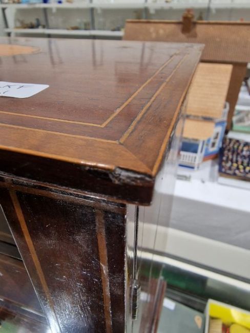 Several of the drawers have sections of inlay missing or damaged. There is a worn section to the back right corner on the top aswell as a chip to th efront right corner. There is a split down the right side. The drawers all run smoothly and the key worsk. The internal heights of the drawers are approx 6cm. Please see attached images.