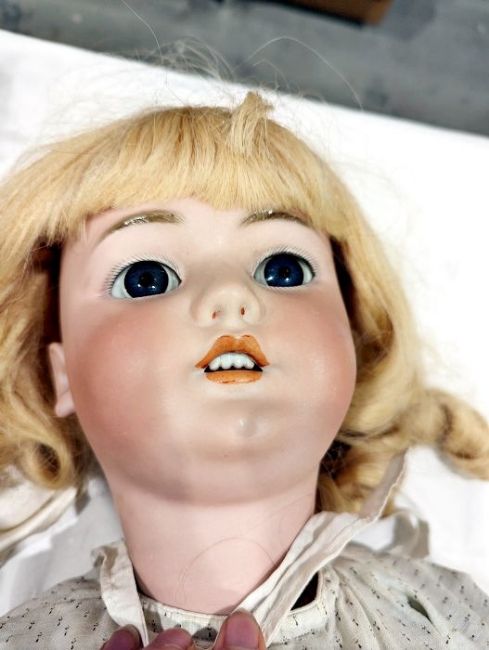 Large Simon & Halbig bisque head doll, marked S&H 1079/DEP Germany 15, with jointed composition limbs and body, blonde hair and blue eyes, wearing a flower-pattern white cotton dress and bonnet, 82cm Condition ReportBisque head in good overall order, with fixed eyes, hair later replacement and loose with glue deposits evident. Some chipping, flaking and discolouration to body and limbs, some restuck chipping, scratching to legs, with some cracking to fingers, possible retouching and restoration, one (modern) earring present, clothing probably later replacements.