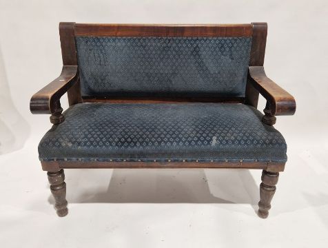 20th century stained wooden pub bench with upholstered seat and back, 98cm high x 122cm wide