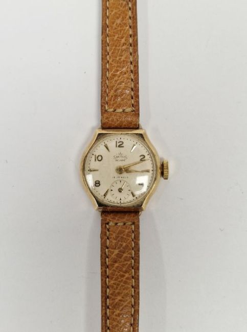 Vintage Smiths de luxe 9ct gold cased lady's wristwatch, the circular dial having alternating gilt Arabic and arrow hour markers, seconds subsidiary dial at the half hour mark, on later leather strap