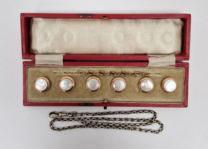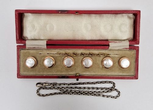 Set of six gent's dress buttons, each set with mother-of-pearl and a white metal albert chain