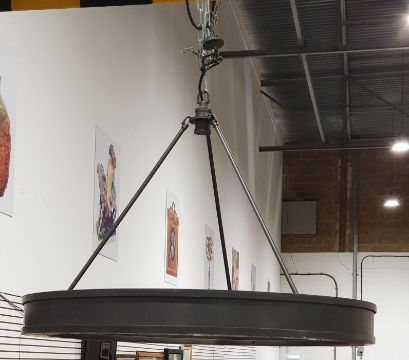 Ralph Lauren Roark modular ring chandelier in Aged Iron finish, with retailer's label marked for model no. RL513IAI-EU, hanging from three supports, with ceiling rose/fixture, the lighting ring 74cm diam.