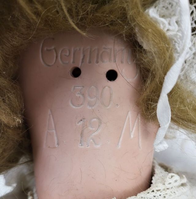 Large Armand Marseille (German) bisque head doll, early 20th century, numbered 390/A12M, with jointed composition limbs and body, with blonde hair and brown eyes, wearing a white cotton dress, 75cm long