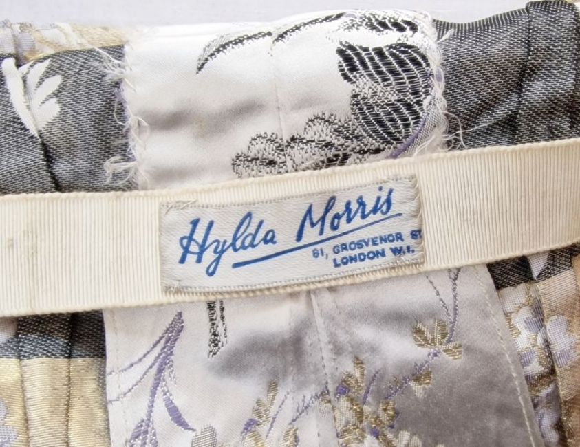 1940's/50's brocade evening dress with plaited shoulder straps, fitted with two fishtail elaborate trains.