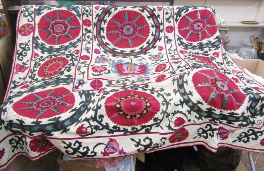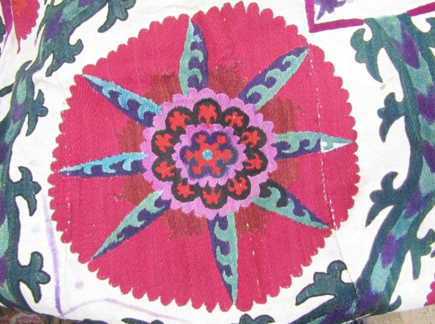Antique Turkish/Uzbekistan Suzani worked in traditional bold colours with central circular flowerhead flanked by palmettes and having flowerhead border, in pinks, greens and blues, all embroidered on linen base and backed by hessian, worked in sections and stitched together, the dimensions are approx 273cm high x 202cm wide.