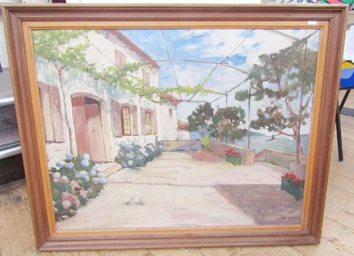 House and terrace in seascape, signed lower right, 89.5cm x 68.5cm