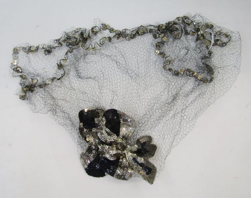 1920's/30's head piece with silver and black sequinned bows, with net sequin veil