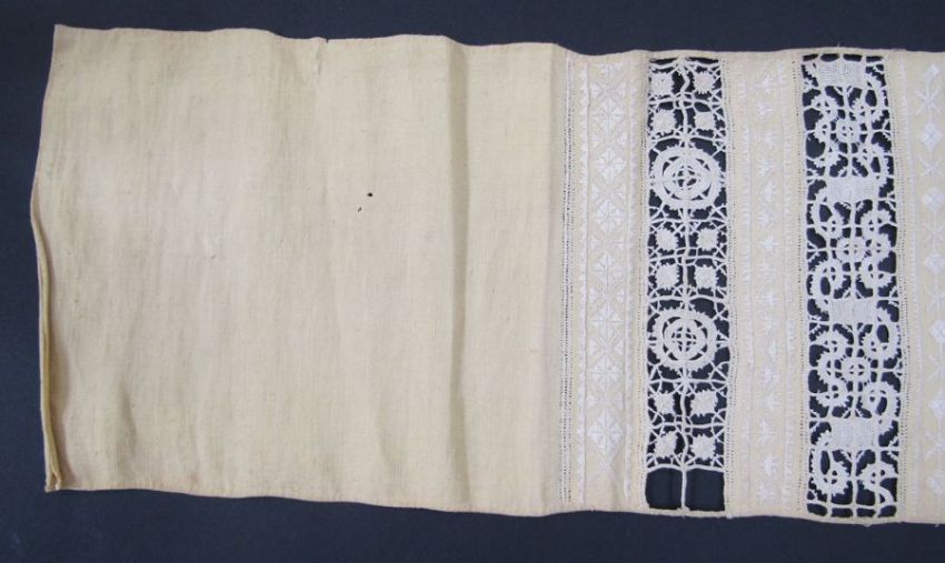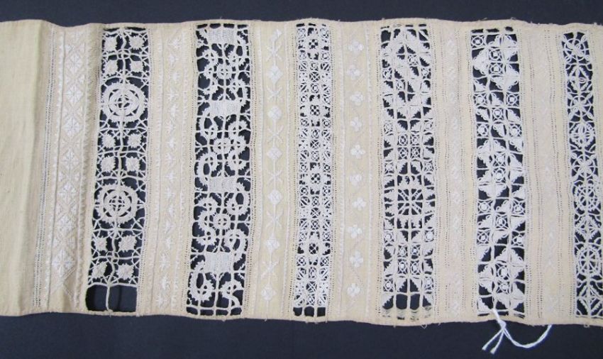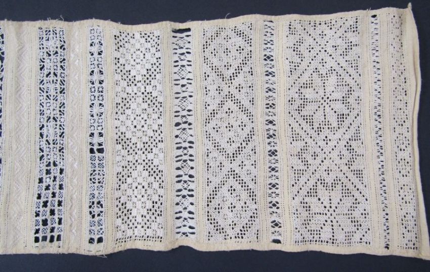 17th century needlepoint reticella banded sampler on linen, showing various rows of lace with embroidered bands, 87cm long x 18cm wide
