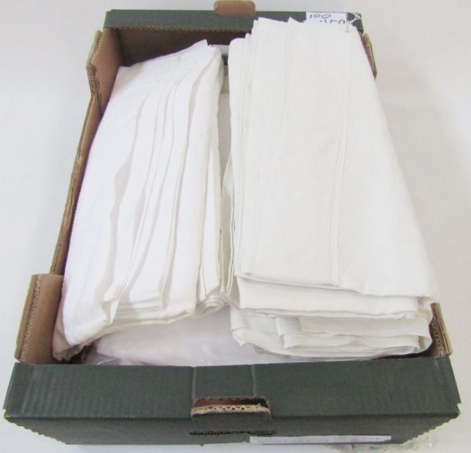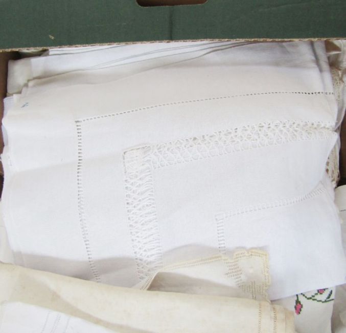 Two pairs of linen sheets, quantity of table linen to include table cloths, hand towels, mats, napkins etc ( 2 boxes)