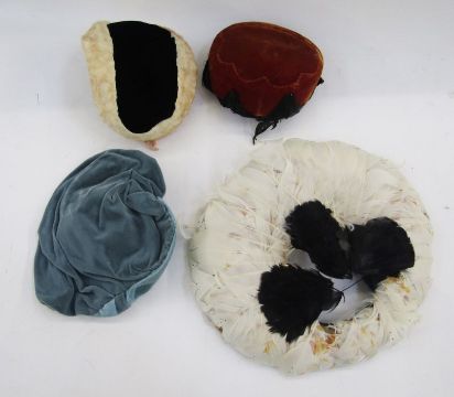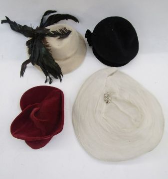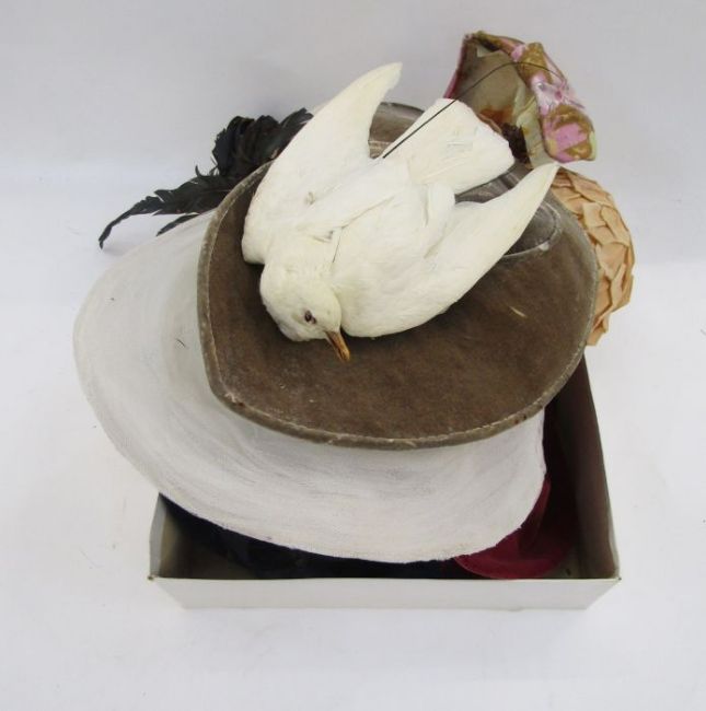 Assorted mid and earlier 20th century hats to include velvet, black wool, one labelled 'Jeanne Tete', feathers, chiffon, net, etc (1 box)