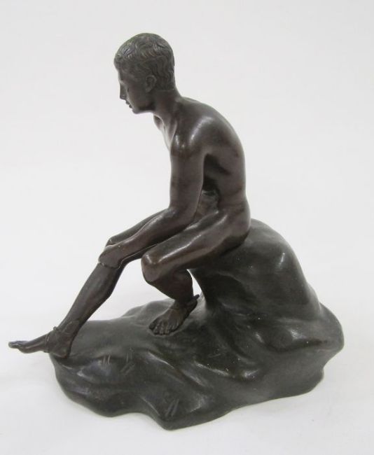 Figure of Hermes seated on a rock, Caduceus staff missing, 20cm long x 20cm high.