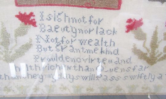 Needlework sampler by Elizabeth Garnett, dated 1840, Aged 17, decorated with a cat, rabbit, houses and carnations flanking a verse, framed and glazed, 41cm x 37cm exc. frame