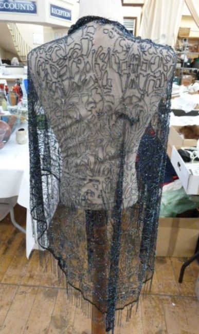1920's shawl, black net embroidered with midnight blue beads, a beaded fringe