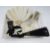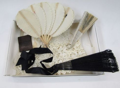 Ostrich feather fan with black painted wooden sticks (three are repaired), a Chinese/Japanese paper fan painted with birds, another fan with wooden guards and painted decorations, another black net fan decorated with silver sequins, two pieces of lace and a small leather folding money holder (1 box)