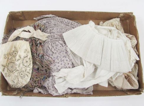 Various mid 19th century items - to include a 'Poke' bonnet, printed cotton in purple with stripes and flowers, bow detail to the back and tie fastening under the chin, a tightly pleated white collar 'Puritan' style, with broiderie anglaise trim to the side, and a plain fichou attached, a white cotton 'mob' cap, three other lawn cotton with lace trim, all rather stained and worn, a baby's bonnet embroidered satin, a brown velvet hat, and a late 19th century shawl in a Persian style design (1 box)