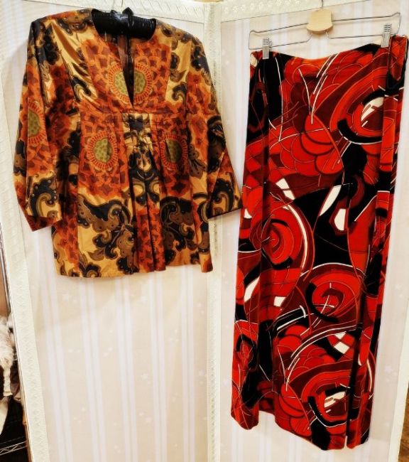 1970's/80's Mexicana pintucked and lace detail blouse with full-length sleeves trimmed with lace, a Liberty-style fabric 1970's maxi skirt, a silk top labelled 'Jim Thompson' in browns, greens and gold, a 1970's velvet maxi skirt with bold retro pattern in oranges, blacks and brown and a three-quarter length jacket, possibly made from a paisley shawl with buttons covered in matching fabric (worn) (5)