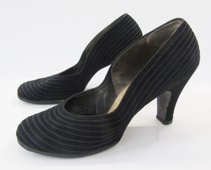 A pair ladies 1930s/40s black velvet high-heeled court shoes and pair of mid 20th century gold and white leather sandals with silver and gold sequin decoration.