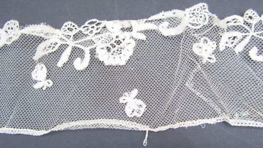 19th century length of Honiton-style on net edging, 275cm long x 7cm deep approx., another similar length, 105cm x 9cm deep approx., two short lengths of narrow edging and similar bonnet veil (5)