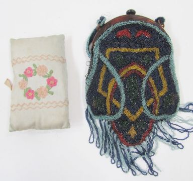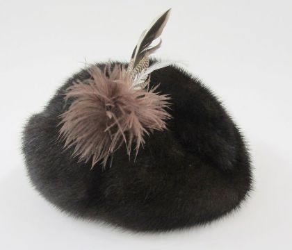 Mid 20th century leather handbag with amber-coloured bakelite fixed frame and leather handle, an Edwardian beaded bag with bakelite fixed frame (losing beads), a small pincushion, a box with two hair nets, a vintage brown mink hat with a feather detail and a black sheepskin hat (6)