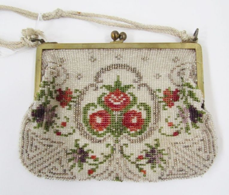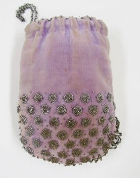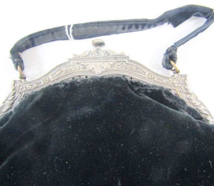 Edwardian velvet evening bag with silver-plated fixed frame, with repousse decoration and button press opening, a 1920's velvet evening bag with metal frame and chain, a Victorian velvet reticule with steel embroidered decorations and fringe (velvet very faded) and a vintage evening bag embroidered with beads (4)