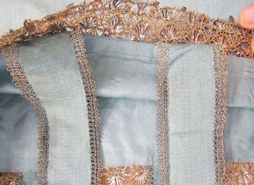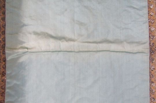 Rare late 16th century/early 17th century embroidered linen cushion cover, worked in coloured silks, silver and silver gilt threads in plaited braid stitch, rectangular and having allover scrolling foliage decoration, Tudor roses, cornflowers, yellow daisies, pomegranates and other fruit, with silver and silver gilt lace borders, allover embellished with silver gilt spangles and having eight pairs blue silk and silver thread ribbon ties to the ends, 46cm long x 34cm wide, ribbons 9cm long. One ribbon missing its brocade, visible from the back only.