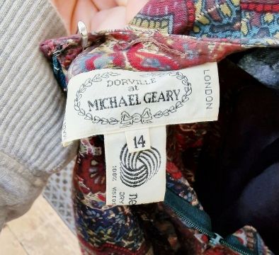 Quantity of various mid 20th century and later dresses to include a Liberty print cotton shirt dress with pintuck detail and short sleeves, labelled, a raw silk green cocktail dress with bow detail to the neck, three-quarter length sleeves, a Jaeger cotton dress, floral on blue background with matching belt, a green and mauve striped raw silk shift dress, a wool paisley-pattern dress labelled 'Dorville at Michael Geary' size 14 with matching belt and scarf, an apricot-coloured raw silk shift dress, a royal blue raw silk 1980's cocktail dress with full-length puff sleeves, front button fastening with bow detail, an apricot full-length maxi dress, sleeveless, a linen maxi dress shirt dress, a green check and smocked dress labelled 'India Imports', a blue Laura Ashley-style dress labelled 'An Uniquity Patience Designer Collection', size 12 and another 1970's smock dress in Liberty-style fabric, full length sleeves (12)