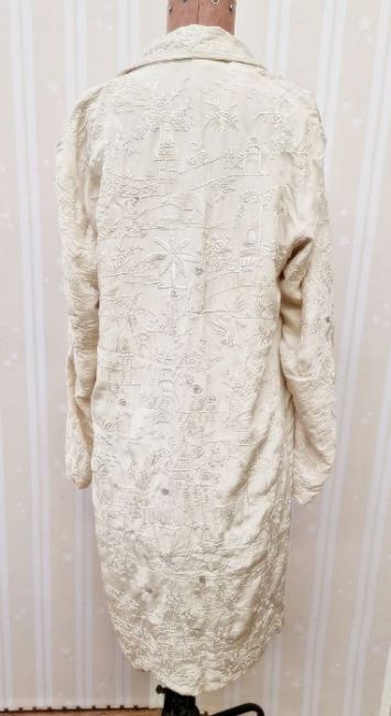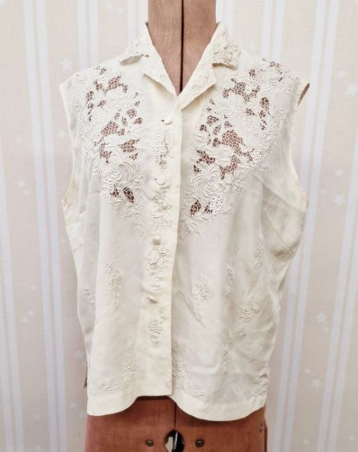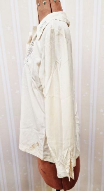Chinese style jacket has some staining around collar and lapel area and patches of staining to front and back, no other visible signs of damage or repair. The sleeveless top has some staining to the right hand armpit and front, good condition no holes or repairs. The silk shirt has a darker stain to front left hand near the bottom, pale staining to collar and general, no holes or visible repair.