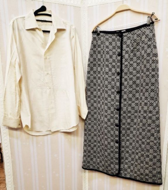 Dark turquoise corduroy full skirt labelled 'Mary Quant', a Welsh wool black and white maxi skirt labelled 'Jon Rowe Fashions Wales', another Welsh blanket-style full-length maxi skirt, a silk shirt labelled 'Lai Wah Hong Kong', a Susan Small flecked linen jacket with three button fastening and a Susan Small cream knitted cardigan with Peter Pan collar and circular cream-coloured buttons labelled 'Susan Small Casual' (5)