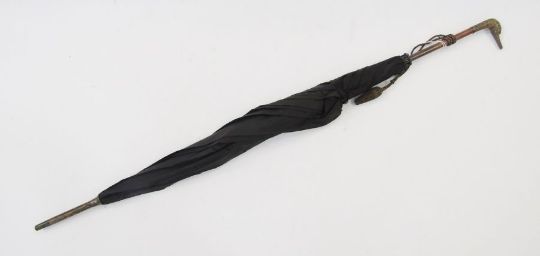 Two vintage umbrella frames and a vintage umbrella with a brass-coloured metal goose head finial (3)