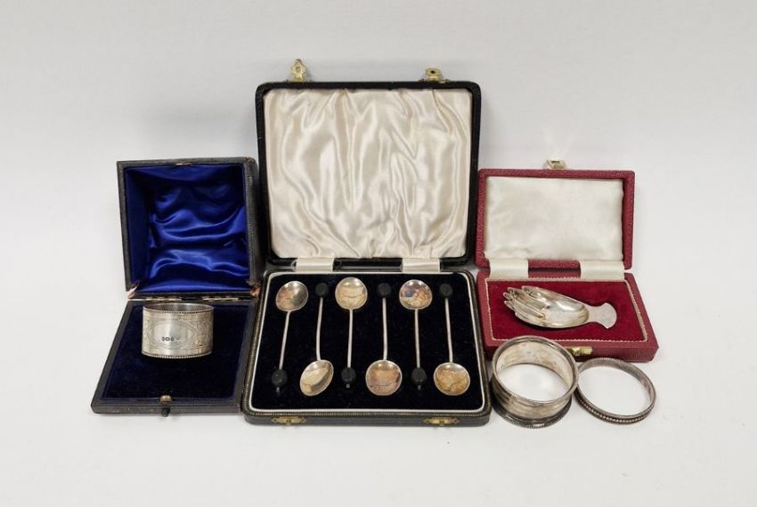 Modern silver caddy spoon in the form of a hand, hallmarked Sheffield 1973 by Francis Howard Ltd, together with  a single silver napkin ring in original fitted box, cased set of six coffee bean silver spoons and more, combined weight approximately 91g