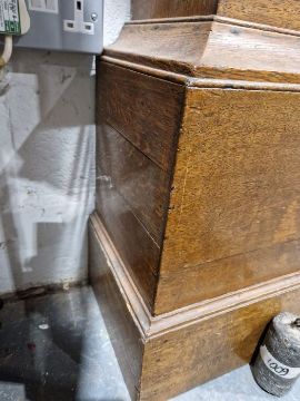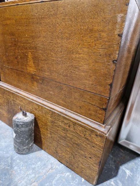 Surface scratches, scuffs and knocks to the case, areas of fading/discolouration, splits to base, area of loss to top back of case. Dial with surface marks, hands detached but present, dial not attached to movement. General wear and tear.