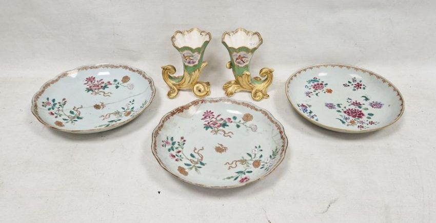 Pair of 19th century Staffordshire porcelain cornucopia vases, circa 1830, green ground, painted with bouquets of flowers supported on an apricot and gilt scroll moulded base, 12.5cm high and three late 18th century Chinese Export porcelain saucer-dishes, all painted in the Famille Rose palette with flower sprays (damages) (5)
