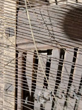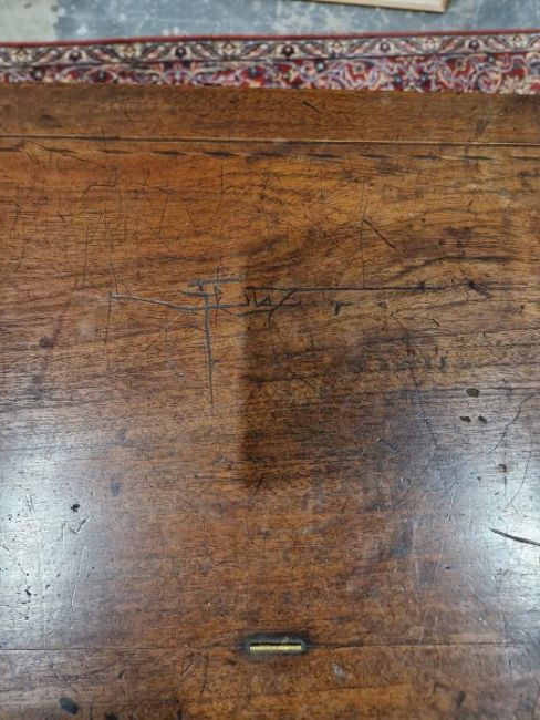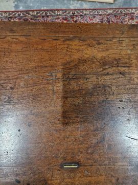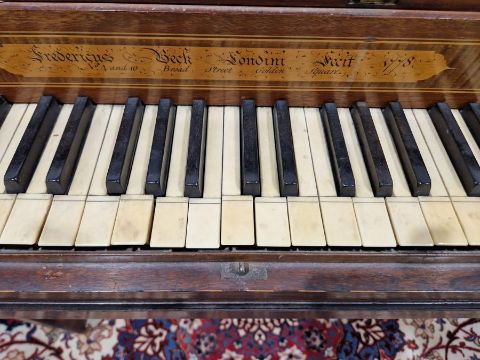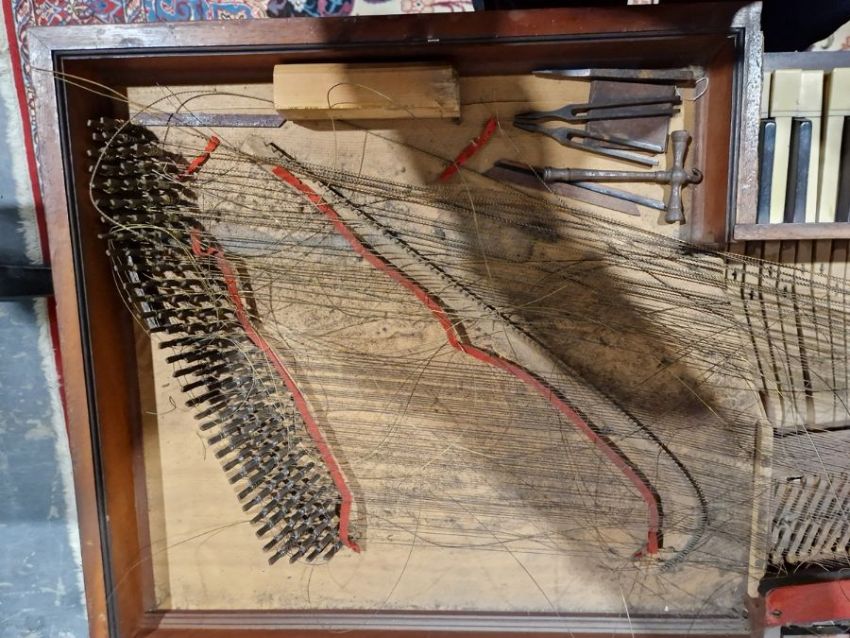 Surface scratches, scuffs and knocks to the wood. Small area of loss to the ebonised moulding on side of top. Some fading, discolouration and staining to the wood. Sheet music holder are missing/broken. Not in working order and in need of restoration. Some keys make a sound but many of the strings are not attached and some hammers are unattached. There are inked note names next to tuning pins on soundboard. General wear and tear.
