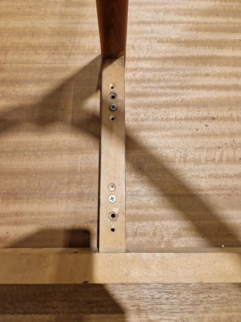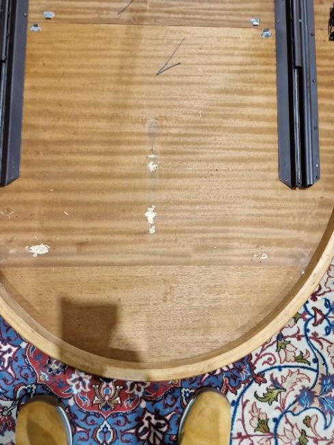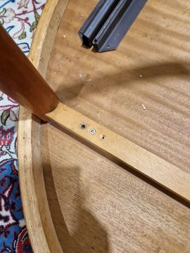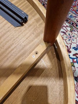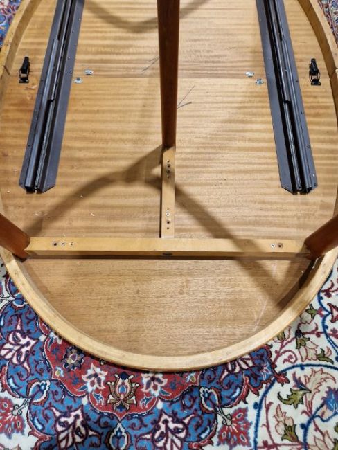 Has two leaves. One leg section with repair and has detached from the table top