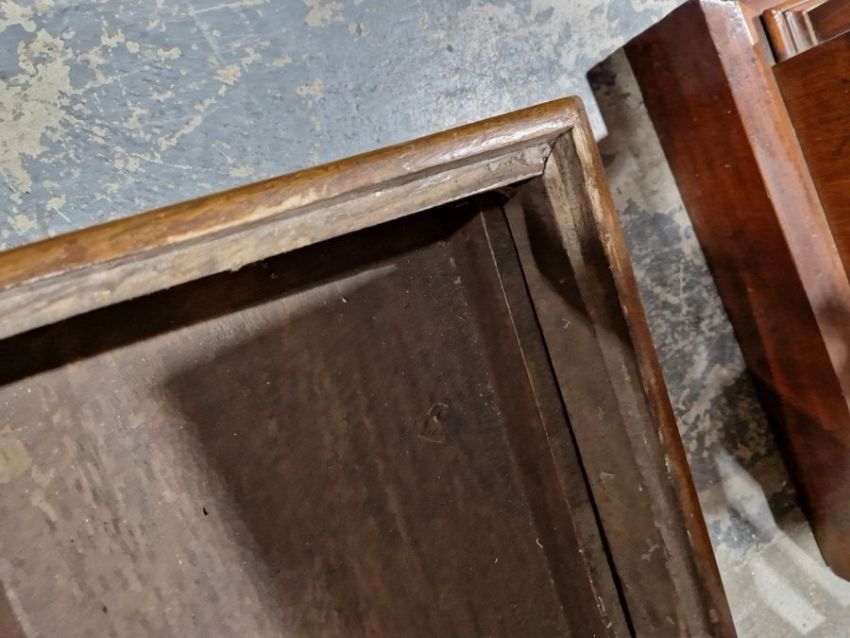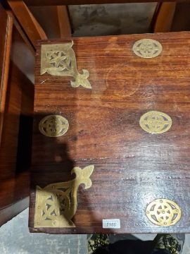 Surface scratches. scuffs and knocks, areas of fading, discolouration and staining. One brass lozenge missing from front of lid. Both base and coffer with carved 'IN' in wood. One hinge loose and missing a screw. Slight gaps to back joints. Top seperates from base. General wear and tear.