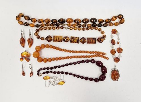 Short string of red amber coloured graduated oval beads, another string of yellow-coloured amber beads and other amber-coloured stone set jewellery to include bracelet and earrings