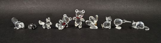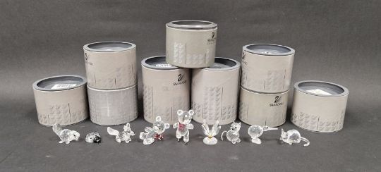 Nine Swarovski crystal animal models to include a bear on ice skates, a reclining bear, a ladybird, beaver, mouse, cat, butterfly, kiwi and a fox, all with original boxes (9)