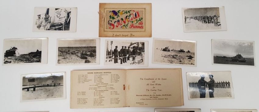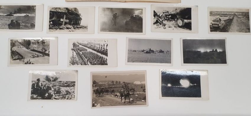 Quantity of official WWII photographs passed by the Publicity Censor, from desert campaigns showing tanks, Montgomery medal ceremony, etc and an embroidered card