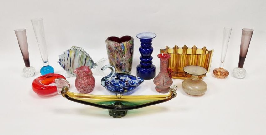 Collection of coloured glassware including a Murano 'Tutti Frutti' cased vase with scrambled millefiori canes and aventurine probably Dino Martens for Aureliano Toso, 16.5cm high, a Murano model of a fish and a swan dish, four bubble inclusion spill vases, a blue cased and hooped glass vase, a Murano style glass gondola and other items