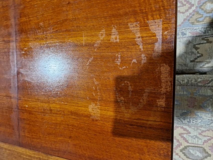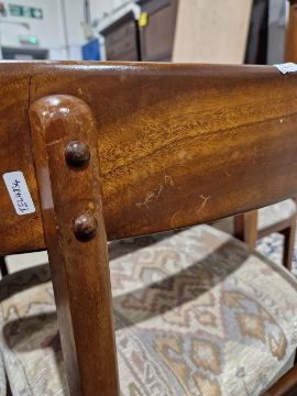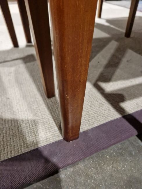 Surface scratches, scuffs and knocks to table and chairs, areas of fading and discolouration to all. Wear and losses to varnish. General wear and tear. Length of table extended - 182cm