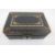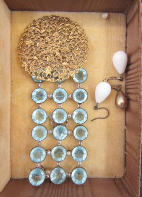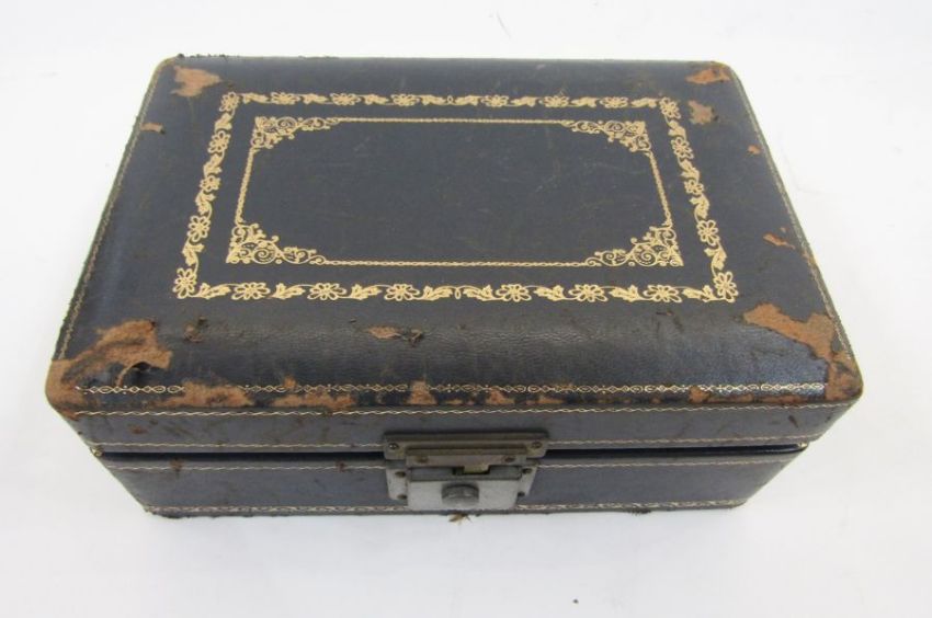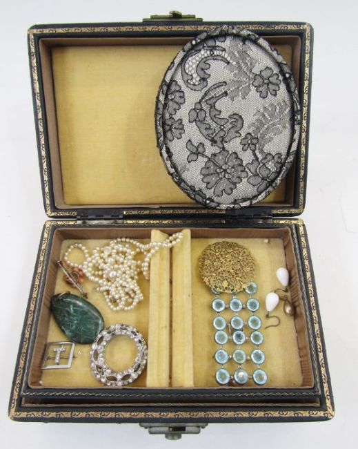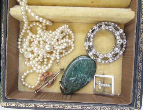 Jewel box, leather with gilt ruled decorations, tray lifts out, lined with velvet, a faux-pearl 1920's-style necklace, a metal and turquoise-coloured paste buckle, gilt floral decoration, a paste clip (some pieces missing), a small paste brooch, a green-coloured stone pendant, a small coral brooch and two earrings